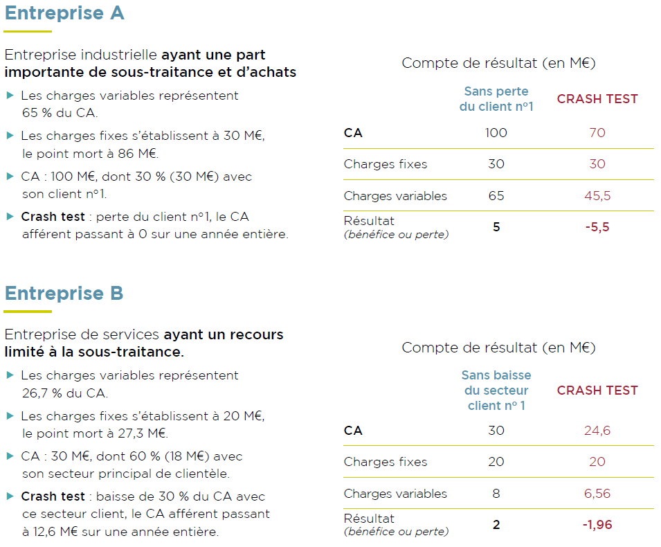Ces exemples fictifs sont bien sûr simplistes. L’évaluation de l’impact sur les charges de l’entreprise devra être effectuée avec une plus grande précision, afin de simuler l’adaptation du fonctionnement de l’entreprise face à ce choc brutal. Une fois la méthode en place, il sera aisé de tester plusieurs scénarios : baisse du CA avec le client n°1 de 50 % seulement, baisse de 40 % avec le secteur client principal…