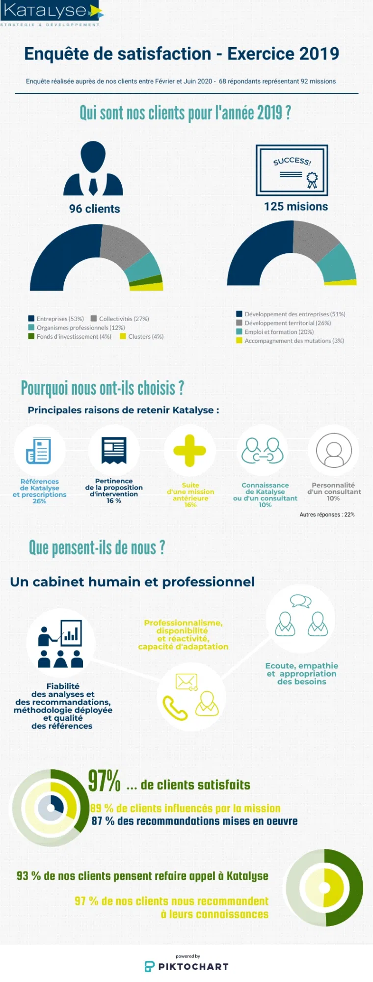 La satisfaction que nous devons à nos clients est une priorité permanente pour Katalyse. Afin d’être en mesure de poursuivre nos actions d’améliorations, nous conduisons chaque année une enquête de satisfaction sous forme d’entretiens qui porte sur l’ensemble des missions réalisées durant l’exercice 2019. Celle-ci a pour but d’appréhender votre niveau de satisfaction sur nos produits et services, et de mieux déterminer vos besoins et attentes.
