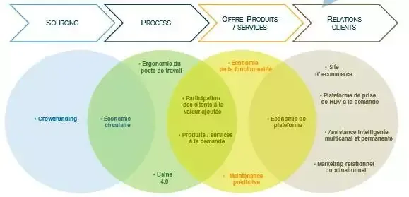 Nous avons choisi 13 modèles de disruption, organisés selon leur position dans la chaîne de valeur, pour lesquels nous avons identifié des exemples réussis de mise en œuvre au sein de PME & ETI :